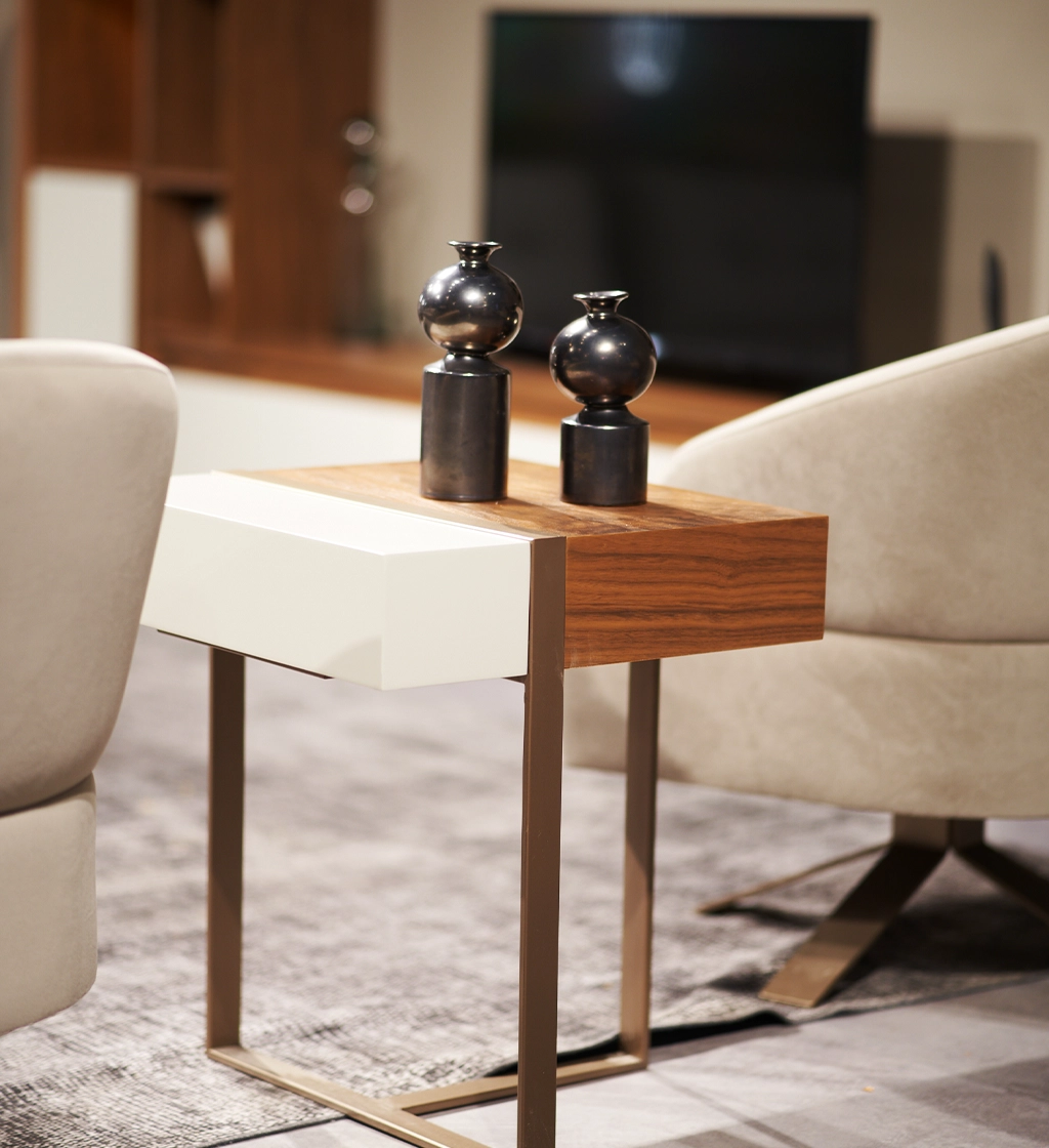 - Îmbogățind estetica naturală a furnirului ondulat de nuc cu combinația sa unică de materiale, Masa laterală Sacramento creează un spațiu stilizat cu designul său atrăgător și caracteristicile funcționale. Suprafețele din lemn care însoțesc combinația de bronz și lac de pietriș mat lasă un efect elegant și rafinat în spațiile tale de locuit.